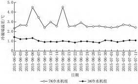 廣場(chǎng)空調(diào)機(jī)房擁有12臺(tái)某品牌集中空調(diào)冷水機(jī)組,其中3#離心式冷水機(jī)組制冷量為2110kW,輸入功率為400kW,安裝了冷水機(jī)組同品牌端蓋式膠球清洗裝置,其控制系統(tǒng)與冷水機(jī)組互聯(lián)互通,根據(jù)冷凝端溫差控制膠球清洗使得二者在其佳效率點(diǎn)附近運(yùn)行。7#離心式冷水機(jī)組制冷量為4218kW,輸入功率為738kW,2臺(tái)冷水機(jī)組共用冷卻水源,冷凝器換熱管均進(jìn)行了捅炮清洗。圖7顯示了3#和7#冷水機(jī)組冷凝端溫差。從圖7可以看出:未安裝膠球清洗裝置的7#機(jī)組2015年6—7月的冷凝端平均溫差為2.80℃,而安裝了冷水機(jī)組同品牌膠球清洗裝置的3#機(jī)組冷凝端平均溫差為1.05℃,3#機(jī)組比7#機(jī)組單位制冷量的能耗降低了6.8%,表明同品牌膠球清洗裝置是保證冷水機(jī)組始終處于高效運(yùn)行的關(guān)鍵設(shè)備。