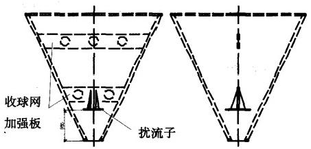 (3)經過與廠家協商,為克服循環水出口壓力偏高造成的膠球在收球網內的強烈旋轉,如圖2所示,在膠球清洗裝置內部加裝擾流子,要求擾流子材質為Q235,擾流子和收球網加強板要可靠地焊接。以降低冷凝器循環水出口的壓力及膠球在收球網內部的旋轉強度,從而使膠球順利地落入收球網底部,及時送入收球泵入口管道。