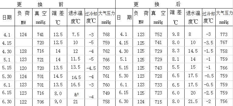2、每臺機每兩天進行一次膠球清洗,每次投入300個膠球,清洗1小時,收球半小時。經過兩年的實踐,證明14FH-5-0凈水器和S-14-0收球網操作方便、除污性強、耐海水腐蝕、收球率在95%以上、對凝汽器冷卻管保護膜沒有損壞、減輕了檢修人員的勞動。凝汽器各項經濟指標大有好轉,經濟效益顯著提高。以1號機為例,更換前、后每月抽出三天,以每天上午9點鐘的運行參數進行同期比較,見附表.