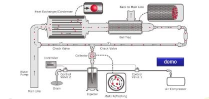 CQM公司的膠球清洗系統的創新設計確保膠球零逃逸。此為CQM系統的工作原理圖,其中捕球器的創新設計確保了膠球零逃逸。