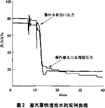 凝汽器快速放水的缺點(diǎn)是:可能會(huì)產(chǎn)生循環(huán)水泵倒轉(zhuǎn)的情況,由于循環(huán)水泵葉輪一般是采用套裝的軸套,上有絲扣擰在軸上,擰的方向與軸轉(zhuǎn)動(dòng)方向相反。所以,當(dāng)泵順轉(zhuǎn)時(shí),就愈擰愈緊,如果反轉(zhuǎn)就容易使軸套退出,葉輪松動(dòng)會(huì)產(chǎn)生摩擦。另外,循環(huán)水泵葉輪兩側(cè)的軋?zhí)m填料也存在同樣情況,反轉(zhuǎn)可能會(huì)使填料松動(dòng),漏水。單位3套S109FA機(jī)組循環(huán)水系統(tǒng)多次試驗(yàn)中快速放水時(shí),在沒有釆用限流措施的情況下(凝汽器水側(cè)自動(dòng)透氣閥全開,循環(huán)水泵的出口液控蝶閥全開),現(xiàn)場(chǎng)也未見循環(huán)水泵倒轉(zhuǎn)。再例:由于凝汽器兩側(cè)出水閥關(guān)閉不嚴(yán),按正常方式放水,整整24h,也未將水放盡,后通過凝汽器快速放水法,15min解決問題。所以,當(dāng)采用限流措施快速放水時(shí),應(yīng)該更安全,只要確保凝汽器兩側(cè)出水閥可靠關(guān)閉即可,實(shí)際快速放水實(shí)例曲線如圖2所示。