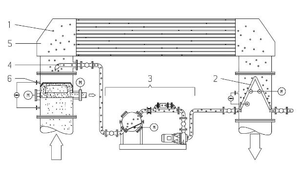 1、清洗球;2、收球器;3、循環單元;4、注球管;5、冷凝器/熱交換器;6、二次濾網。