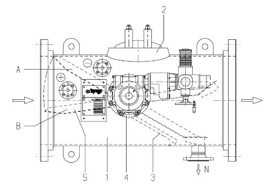 1收球器殼體;6收球網觀察孔;7驅動機構;3導流板N出球管管口;4軸承+/-壓差測量系統接口;5網板半橢圓形收球網;5將膠球引至出球管管口N。